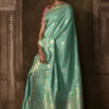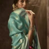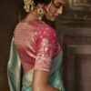 Aqua dola silk wedding saree, designed with thread, zari work enhanced by fancy lace border. The saree comes with a contrast matching blouse.