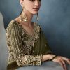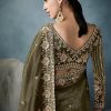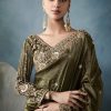Army green embroidered wedding saree, embellished with sequin stone and thread work. The saree comes with a matching contrast blouse.
