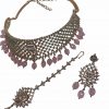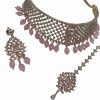 Baby Pink SURI American Diamond Necklace Set. Gold based finish filled with american diamond with baby pink pearl drop hanging beads. These earrings with set are for pierced ears only.