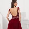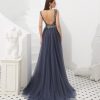Backless Crystal Beading Evening Dress, beautifully hand made together with crystal bead patterns on the dress with empire waistline this comes with padded bust.