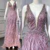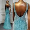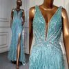 Beaded plunge neck feathered Evening Dress, beautifully hand crafted together with embroidered beaded work patterns all over the dress.