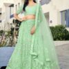 Beige embroidered net party wear lehenga choli made with mirror, thread & sequins work. Comes with matching choli and dupatta.