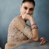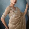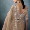 Beige embroidered wedding saree, embellished with sequin stone and thread work. The saree comes with a matching contrast blouse.