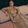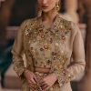 Beige lehenga with jacket, made with thread zari, and sequin work. Comes with matching top, bottom and jacket.