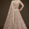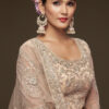 Beige net sangeet bridal lehenga choli, designed with thread, badla & glitter, zari work. Paired with matching embroidered blouse and dupatta.