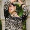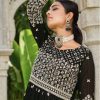 Black Anarkali Style Palazzo Suit, made with thread work on the yoke and lower part of the kameez. Includes top, bottom and dupatta.