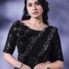 Black crepe crepe silk designer saree crafted with sequin and cord embroidery work. The saree comes with a unstitched matching raw silk blouse.