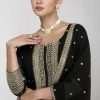 Black front slit embroidered palazzo suit made with thread zari, and sequin work. Comes with matching georgette top, bottom and dupatta.
