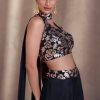 Black palazzo suit with crop top & dupatta, made with thread zari, and sequin work. Comes with matching top, bottom and dupatta.