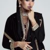 Black silk frock style salwar suit, made with resham work and patch border with touch up patterns on the yoke and lower part of the kameez. Includes top, botyom and dupatta.