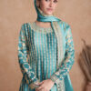 Blue chinon embroidered palazzo suit, made with resham work and patch border with touch up patterns on the yoke and lower part of the kameez. Includes top, bottom and dupatta.