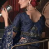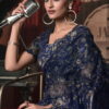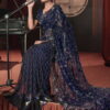 Blue digital net bridal party saree designed with hand made flowers, moti and cut dana heavy work. The saree comes with a matching art silk blouse.