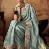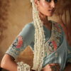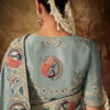 Blue kanjivaram silk wedding saree, designed with minakari, zari work enhanced by stone embroidery and tassels. The saree comes with a contrast green matching blouse.