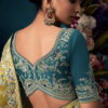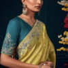 Bright Yellow pure silk wedding saree, designed with thread, zari work enhanced by fancy lace border. The saree comes with a contrast matching blouse.