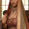 This will fit bust and waist sizes 32,34,36,38,40,42 (UK sizes 6-16). Top length 13-14” max. Lehenga length 42” max. Slight variation in colour is possible. Model accessories and latkans not included.