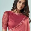 Coral chiffon designer saree crafted with sequin and cord embroidery work. The saree comes with a unstitched matching banglori soft taffeta blouse.