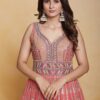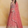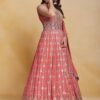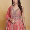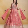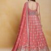Coral georgette embroidered anarkali suit crafted with thread mirror and sequins work. Comes with Top, bottom & dupatta.