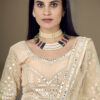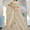 Cream organza Sangeet Lehenga Choli, designed with floral print, sequin, zari work embroidered paired with matching embroidered blouse and dupatta.