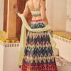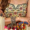 This will fit bust and waist sizes 32,34,36,38,40,42 (UK sizes 6-16). Top length 13-14” max. Lehenga length 42” max. Slight variation in colour is possible. Model accessories and latkans not included.