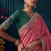 Dark pink pure silk wedding saree, designed with thread, zari work enhanced by fancy lace border. The saree comes with a contrast matching blouse.