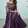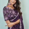 Dark purple crepe silk designer saree crafted with sequin and cord embroidery work. The saree comes with a unstitched matching banglori silk blouse.