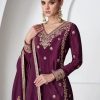 Dark Wine chinon silk embroidered palazzo suit made with thread zari, and sequin work. Comes with matching top, bottom and dupatta.