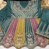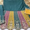 Desi Barbie turquoise embroidered palazzo suit, made with resham work and patch border with touch up patterns on the yoke and lower part of the kameez. Includes top, bottom and dupatta.