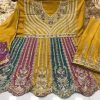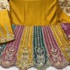 Desi Barbie yellow embroidered palazzo suit, made with resham work and patch border with touch up patterns on the yoke and lower part of the kameez. Includes top, bottom and dupatta.