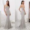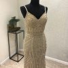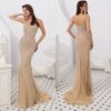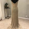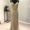 Elegant Beige Long Beaded Evening A- line mermaid dress in sweetheart neckline is beautifully weaved together with embroidered gold stone beaded work patterns all over the dress.
