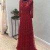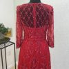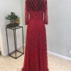 Elegant Red Long Beaded Evening A- line dress is beautifully weaved together with embroidered stone beaded sequin work patterns all over the dress with bra padded .