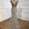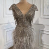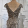 Feathered Plunge Neck Evening Dress, beautifully hand crafted together with embroidered beaded work patterns all over the dress.