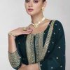 Green front slit embroidered palazzo suit made with thread zari, and sequin work. Comes with matching georgette top, bottom and dupatta.