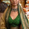 Green rajwadi silk woven lehenga choli crafted with royal themed print, stone and zari work. Comes with matching lehenga choli and dupatta.