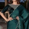 Green satin silk chiffon party wear saree made with intricate embroidery border work. The saree comes with a matching faux velvet blouse.