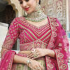 Green silk bridal lehenga choli, designed with sequin, zari work, hand embroidered paired with matching embroidered blouse and net dupatta.