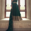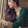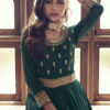 Green silk embroidered anarkali suit made with thread zari sequin work at front of suit with back lower half plain. Comes with matching top, bottom and dupatta.