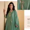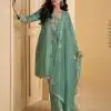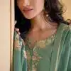 Green silk embroidered trouser suit made with thread zari, and sequin work. Comes with matching top, bottom and dupatta.