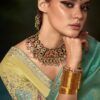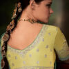 Green woven silk wedding saree, designed with zari work enhanced by thread embroidery. The saree comes with a contrast yellow matching blouse.