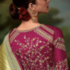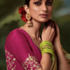 Green woven silk wedding saree, designed with thread, zari work enhanced by gota patti embroidery. The saree comes with a contrast pink matching blouse.