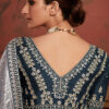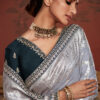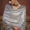 Grey soft dola silk wedding saree, designed with thread, zari work enhanced by fancy lace border. The saree comes with a contrast matching blouse.