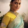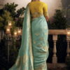 Light blue dola silk wedding saree, designed with thread, zari work enhanced by fancy lace border. The saree comes with a contrast matching blouse.