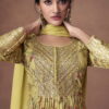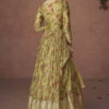Light green organza silk anarkali gown, made with thread zari sequin work. Comes with matching top and dupatta. Bottom pant is not included in gown.