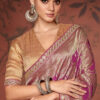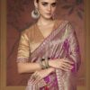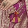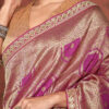 Pink soft dola silk wedding saree, designed with thread, zari work enhanced by fancy lace border. The saree comes with a contrast matching blouse.
