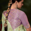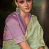 Light green tissue silk wedding saree, designed with thread, zari work enhanced by stone embroidery. The saree comes with a contrast lilac matching blouse.