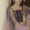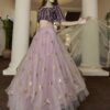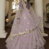 Light purple embroidered net party wear lehenga choli made with thread & sequins work. Comes with matching dark purple choli and light purple dupatta.