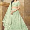 Beige embroidered net party wear lehenga choli made with mirror, thread & sequins work. Comes with matching choli and dupatta.