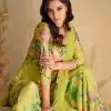 Lime green chinon floral print sharara suit made with thread zari sequin work. Comes with matching top, bottom and dupatta.