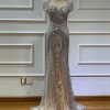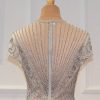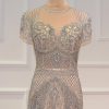 Lux Short Sleeve Crystal Evening Dress is beautifully weaved together with beaded, Sequinned,Crystal work patterns over the dress with bra padded. Empire waistline. Court train at back