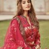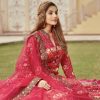 Magenta digital print anarkali gown, made with handwork embroidery. Comes with matching top and net dupatta. Does not come with trouser.