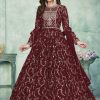 Maroon Abaya style georgette embroidered anarkali suit, made with resham work and patch border with touch up patterns on the yoke and lower part of the kameez.